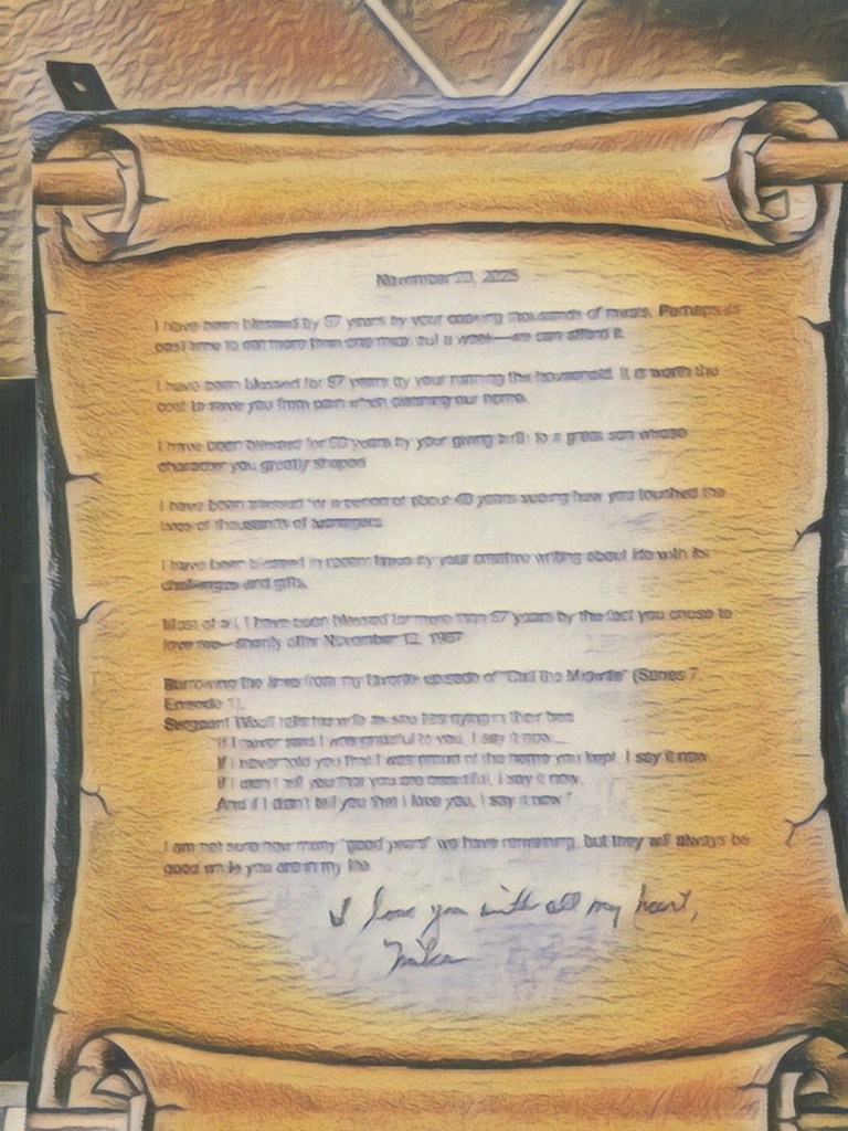 Ironically, our fifty-seventh wedding anniversary soon followed on November 23, and to my surprise, I found his card to me propped near my coffee pot that morning. In addition to the card, he had placed a full-page letter to me. In that letter, he enumerated the many blessings he counted over our fifty-seven years together.