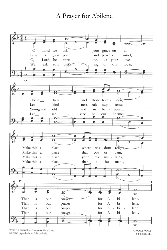 On March 15, Abilene will be observing its 145th birthday. Twenty years ago, to commemorate the city’s 125th anniversary, Greg Young and I wrote a hymn called “A Prayer for Abilene,” and it was sung at a city-wide worship service. It is set to the tune of O Waly, Waly, found in most hymnals. Maybe your congregation would like to sing it as a prayer – and aspiration — for our fine city.