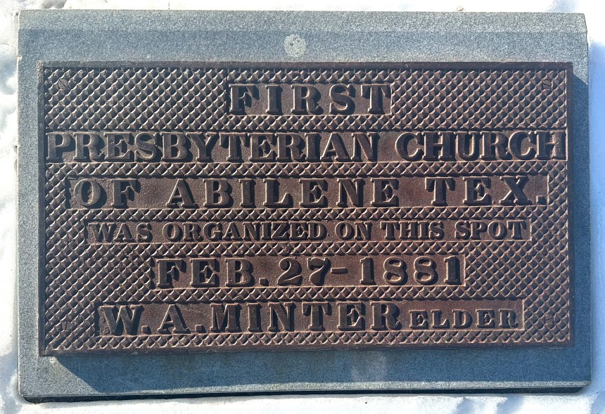 “First Presbyterian Church of Abilene Tex was organized on this spot Feb. 27, 1881. W.A. Minter elder”