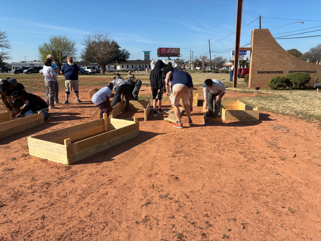 Volunteers help build planter boxes at Westminster Presbyterian Church. Photo courtesy Stephanie Graves