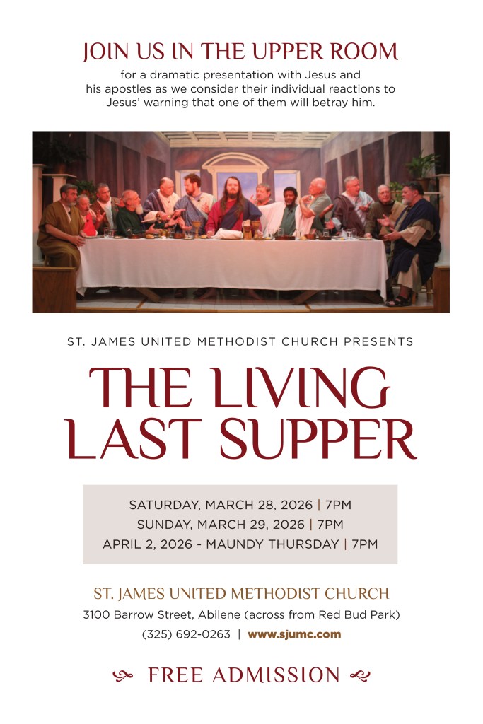 “Join us in the Upper Room for a dramatic presentation with Jesus and his apostles as we consider their individual reactions to Jesus’ warning that one of them will betray him.”